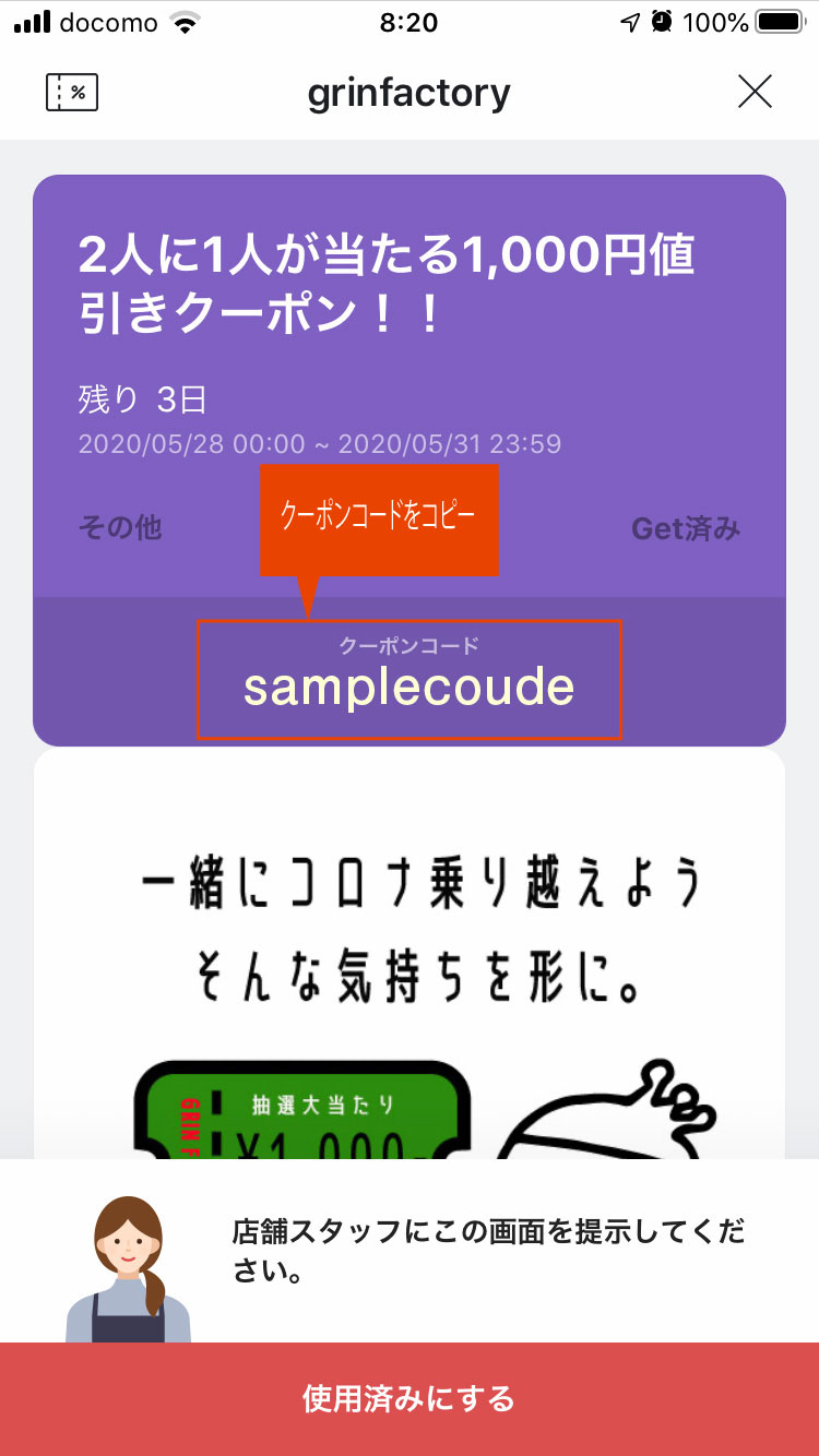 抽選に当たった方は、クーポンコードを使ってクーポンを使用してください。