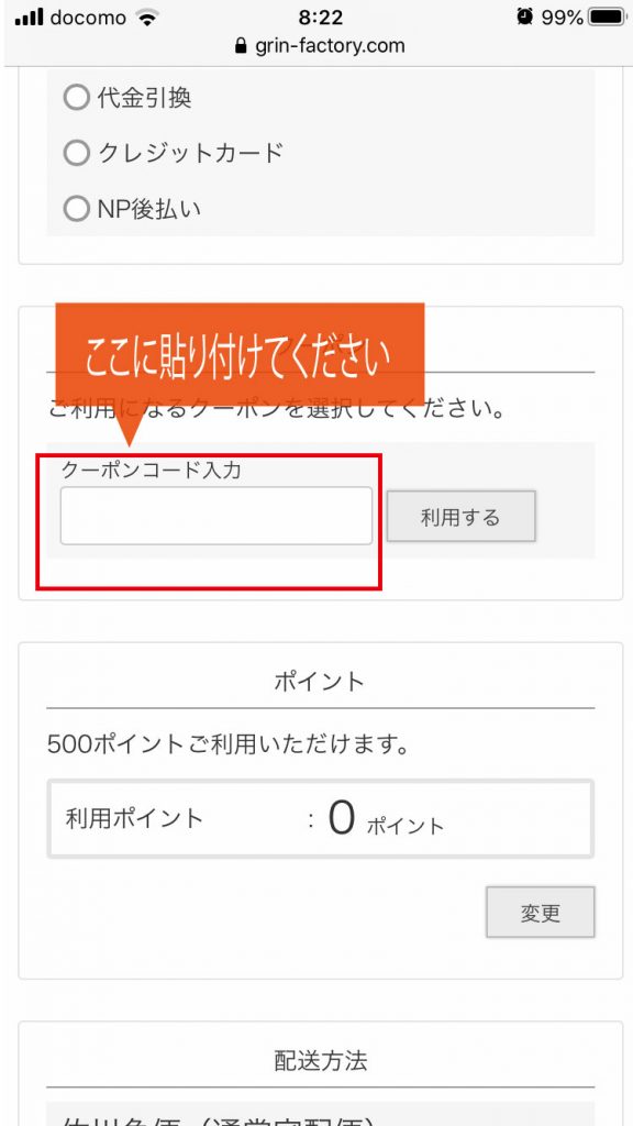 カート内にある「クーポンコード入力」欄に上記で表示されたクーポンコードを入力(または貼り付け)してください。