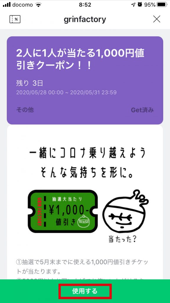 クーポンコードは画面一番下の「使用する」を押すと表示されます。