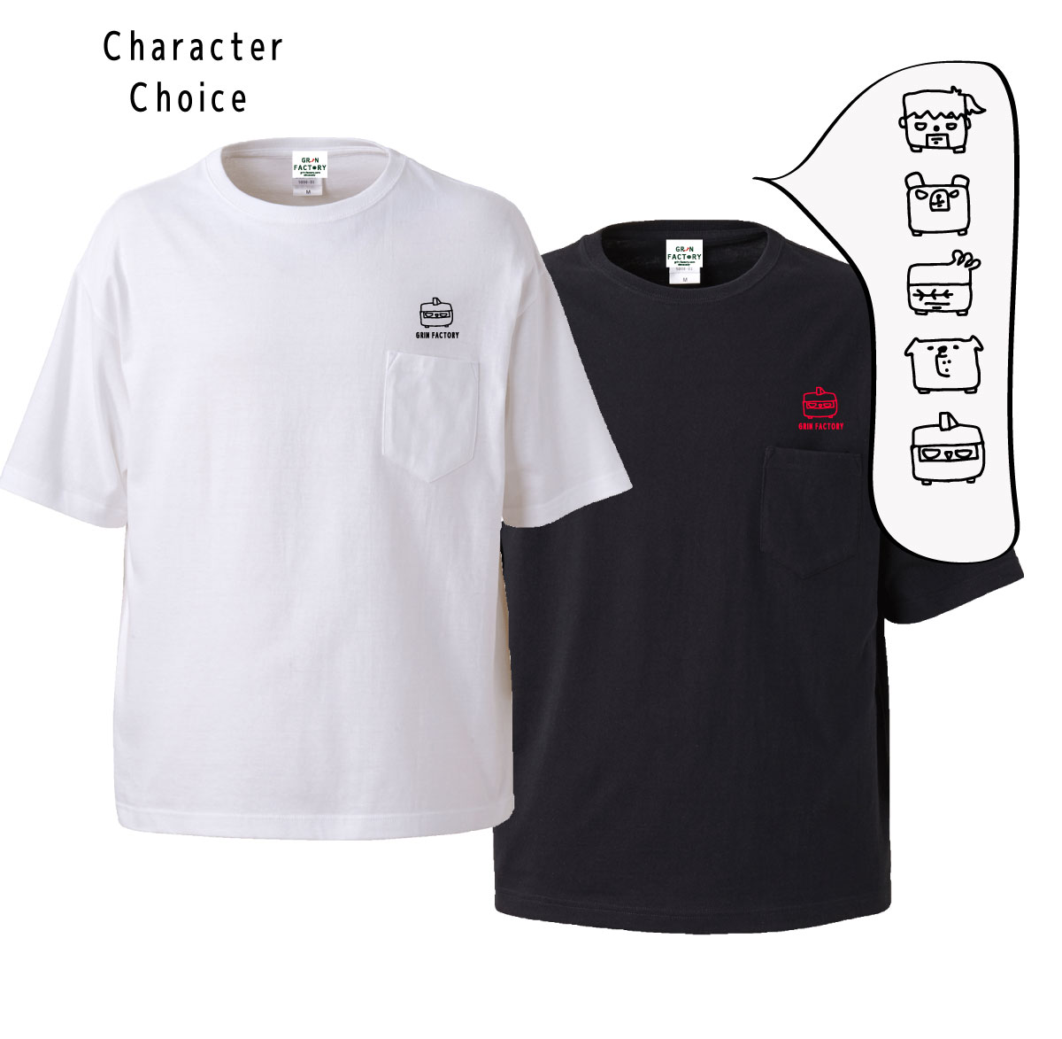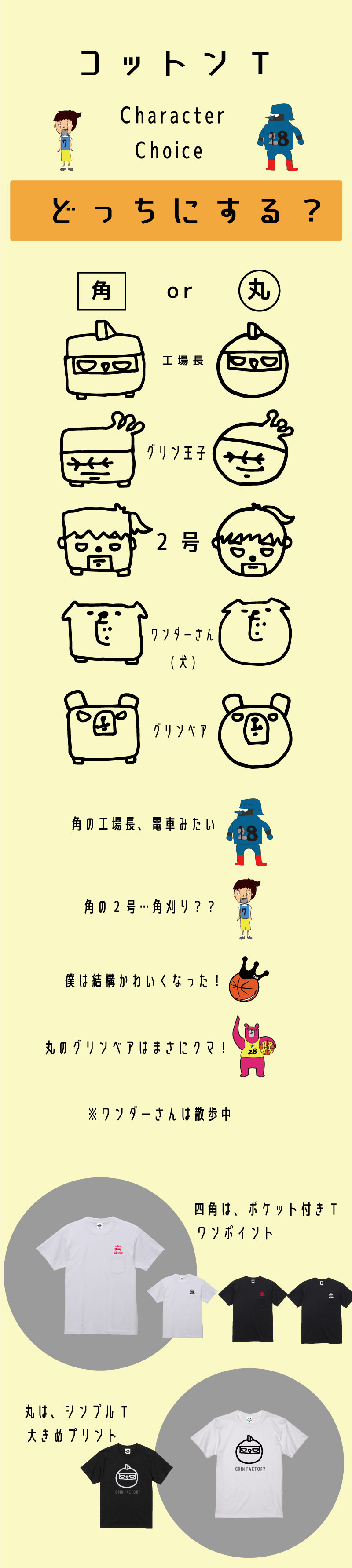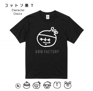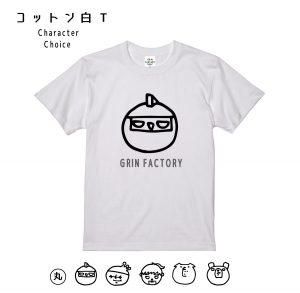 今回のデザインは、GRIN★FACTORYで出てくるキャラクターを四角と丸に変形させてTシャツにプリントしました。