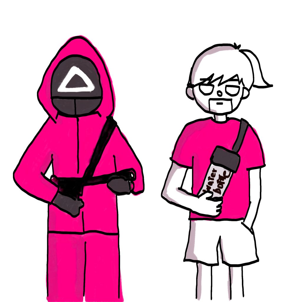 で、そのイカゲームに出てくるスタッフが全員蛍光ピンクな上下を着ていて。