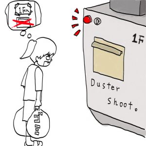 マンションのエレベーターのところに、いちいち1Fまで降りなくても投入できるダスターシュートがあって、そこにシュートすると1階の収集機までウォータースライダーみたいにパイプの中をつたって落ちていきます。