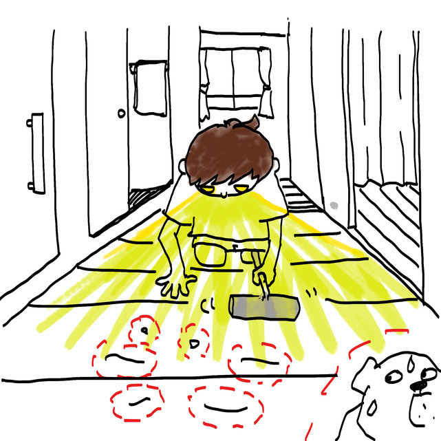 床に這いつくばって手で集めて拾っていましたが、そのうちクイックルワイパーを置いて都度掃除をするように。